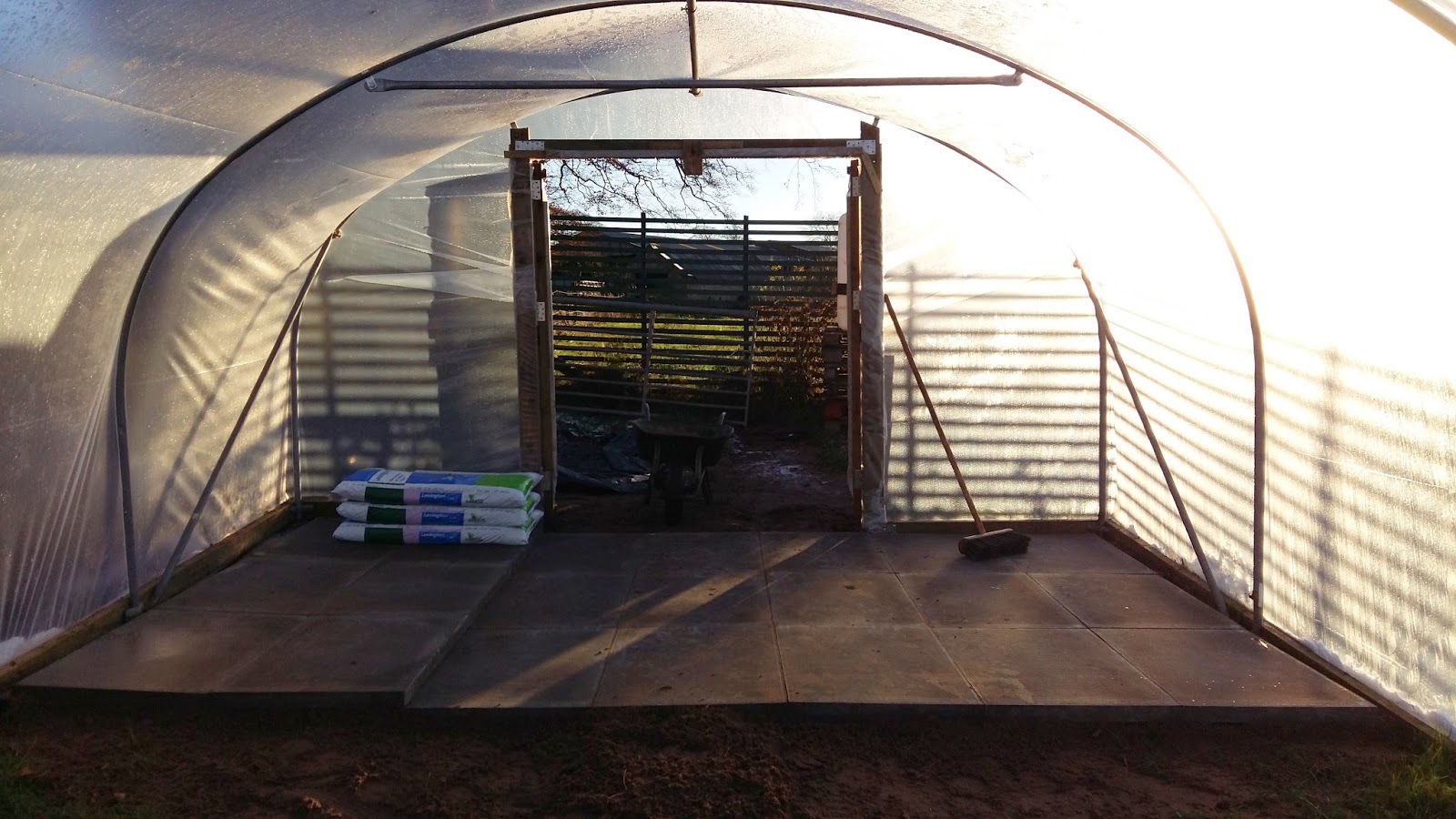 Sunday was more of the same, another frosty day spent laying more slabs. But we got the whole area finished and it looks rather good, even if I say so myself. Now David can get on with building the potting bench and next week we'll strt levelling the rest of the tunnel and laying the plants out.