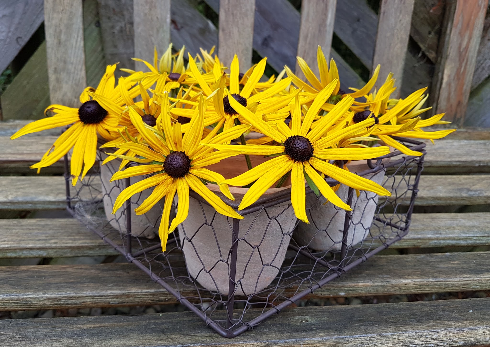 Rudbeckia 'Goldsturm' flowers are like tiny suns brightening up an autumn day. I've put them in this wire and terracotta pot basket for a seasonal display, perfect on a patio table or somewhere it can brighten your day. Goodness knows we all need some of that.